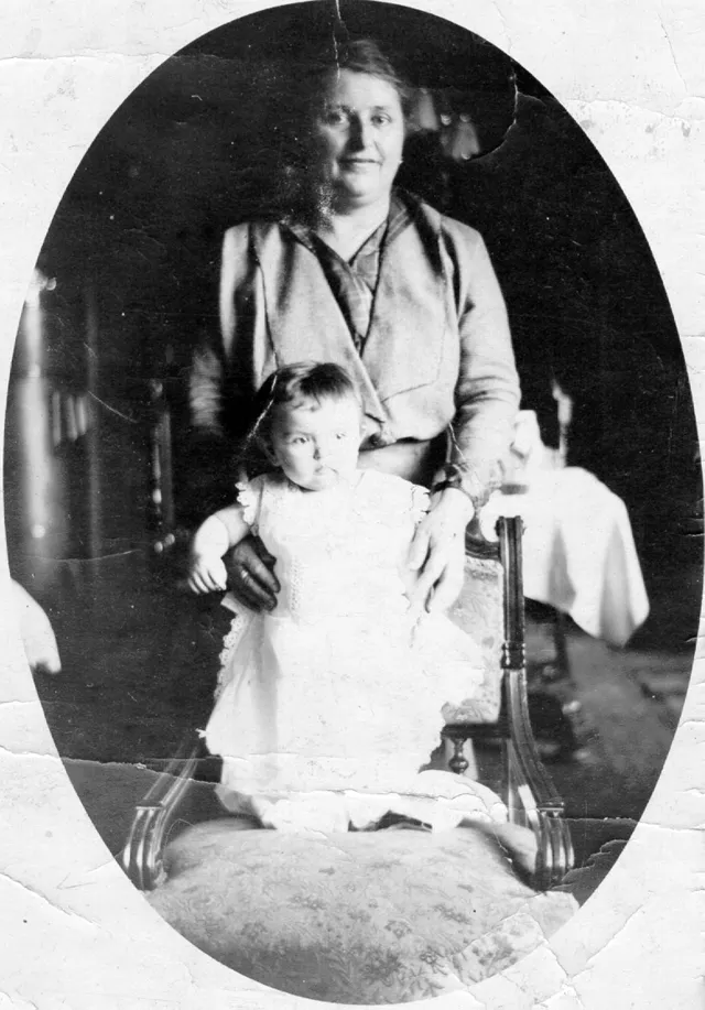This is my mother Suzana Hacker with her grandmother Sirina Bergel [nee Stajnfeld]. The photo was taken in my mother’s home in Senta in 1916 when she was one year old.