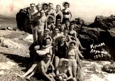 This is I, Alexander Tsvey in Crimean resort in Alushta in 1949. I second to the left in the 3rd row, sitting on the stone. I am surrounded by people who also came to the resort. I did not know any of them and never saw them afterwards.