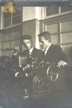 This photo was taken when we were doing practical student work at the Leningrad Military Mechanical Technical School, where I studied in 1947. I don’t remember who took this photo. We are standing at the lathe. I am on the left. My fellow-student stands beside me, I don’t remember his name. It is obvious that we posed for a portrait.
