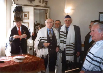 This photo was taken in the winter of 2002, shortly before the death of my brother Toma Kohn. He is the first from the left in the picture, the one who is holding a prayer book in his hand. The photo was taken during a Sabbath service on a Saturday morning. During the winter we don't meet in the synagogue because it's much too cold. Instead, we meet in a room in a retirement center in Arad. The photo was taken just before we were called to the Torah reading.
