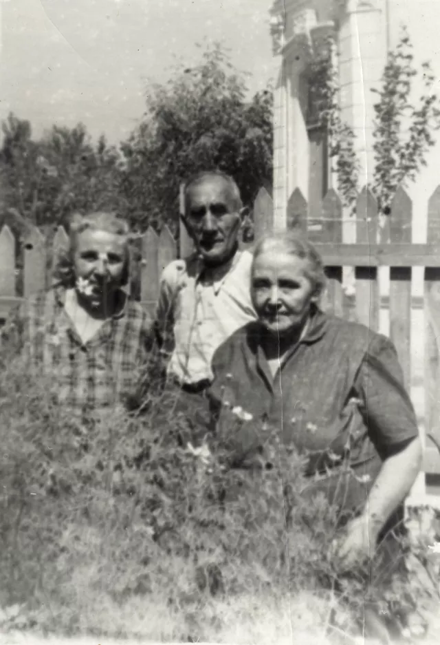 These are my parents Roza and Menahem Alfandari (on the left) together with my mother's sister, Auntie Matilda (first from right), who lived with her family in the town of Byala. Here she had come to visit us, which was the occasion for taking the picture. One can see the fence of our old house in Ruse. It was 1941, that is - days before the Law for the Protection of the Nation was introduced. I can't recall anything else about Auntie Matilda.