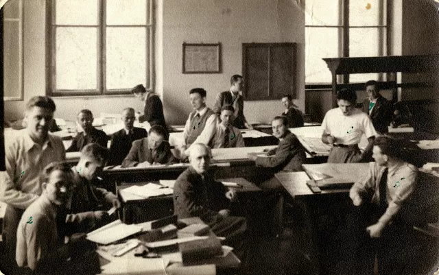 This is a picture of me (second from left) and my colleagues in the Technical University in Brno. It was taken during our classes, in the early 1930s.
