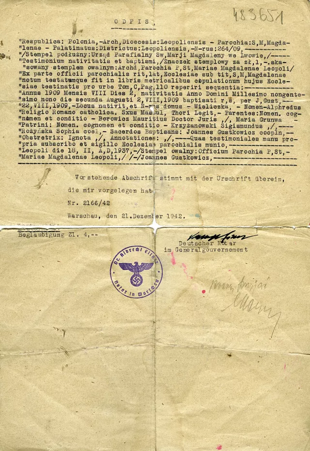 Your ID bore the stamp identifying you as a 'paragraph 16' which meant you were slated for deportation. To avoid that, you had to prove you were a local, that is, have a permanent address there and an ID or a birth certificate from there. The address I had from my student years. I went to the ladies where I had lived in lodgings as a student and they gladly took me in. My ID and birth certificate, in turn, were from Wieliczka. They had classified me as a refugee. I went to Gustkowicz, my friend working as curate at the Maria Magdalena church, and he says, 'listen, I shouldn't really give you a false birth certificate because I'm a state official, but this is not any authority for me, it's an occupation, so I have no scruples.' And I got the certificate.