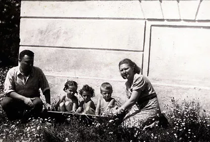 This photo was taken in Dolne Slazany in the summer of 1942, Slazany. I am the one in the middle in the trough. I cannot identify the other children. On the right is my mother Alica Reitmanova, nee Wassermanova, and on the left is her brother Tibor Wasserman.