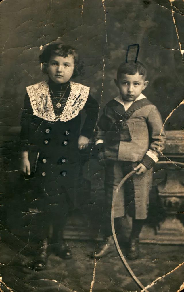 This is me, Alice Kosa [nee Molnar] with my little brother, Bandika [Andras Molnar], in around 1915.