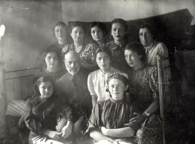This is my grandfather, all his eight daughters and their children in evacuation. Grandfather's daughter Rosa with her husband Nikolai Amurov took in all her sisters and her father.