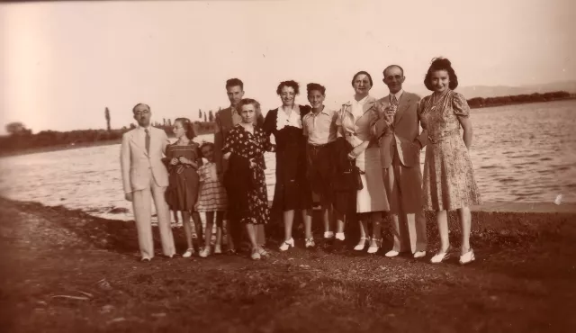 My father is first from the left, my mother fifth from the right, and my step grandmother Mathilde fourth from the left, with my brother Danny behind her.