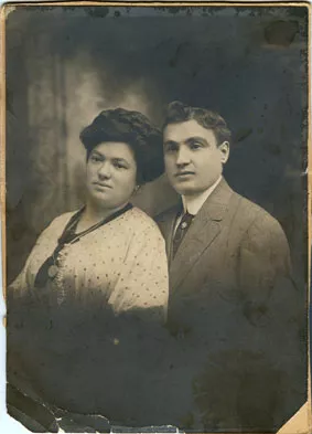 This is a sister of my wife's father together with her husband. Aunt Ana is on the left, and uncle Marcu is on the right. My wife remembers that aunt Ana was killed during the 1941 pogrom, she was paralyzed and they killed her. The photograph was taken in Iasi, probably around 1920-1930. They had 2 sons, Mendel and Avram. They left to Israel with their father after the pogrom, then we lost all contact with them. Marcu was a traveling salesman, he traveled and brought samples from certain factories, and if he managed to find customers, he went and brought the merchandise. This was one of the typically Jewish trades, it was a pretty honorable trade. Like most women, Ana was a housewife.
