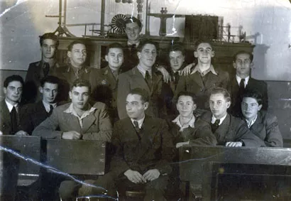 This is a picture of my husband taken in 1940. It is a graduation group photo of the science class in the Zsidlic. This was its short name. It is the group photo of my husband's class. He is the second from the left in the fisrt row. He was studying the sciences. He wanted to become a mechanical engineer. He finished there the elementary school, as well. I knew my husband's classmates because they were hanging around with my brother's class.