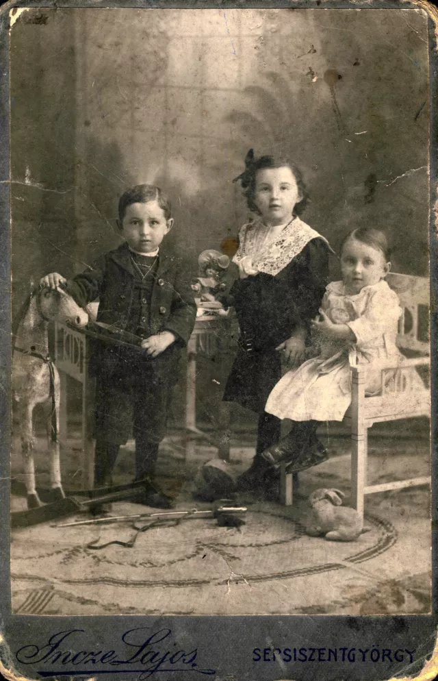 Here are the three orphans: in the center it’s me, Alice Kosa [nee Molnar] at the age of five, my brother, Bandika [Andras Molnar] is three and a half, and my sister, Annus [Anna Czitrom, nee Molnar] is two and a half years old.