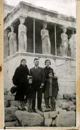 The people in this picture are the members of the Uziyel family. My aunt, Anet Uziyel, her husband Albert Uziyel and their daughters Beki, Seli and Lili. The Uziyel family wanted to go to Israel before the state of Israel was founded. In those days you couldn’t go to Palestine directly, so at first they went to Greece by boat. And then they got on a boat that took them to Palestine. This is a picture that was taken while they were touring the Acropolis in Athens. They sent it to us as a souvenir.
