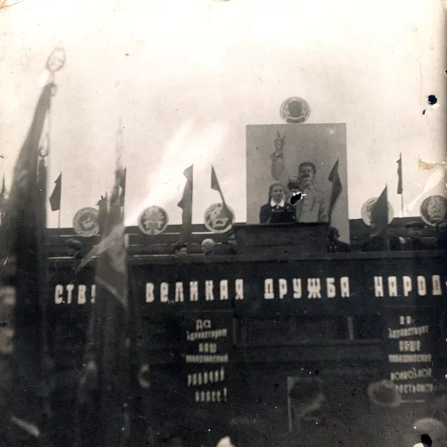 This photo was taken in 1938 in Bologoye. Here you see me on the meeting, celebrating the First of May. I told the hello speech on this meeting (on behalf of all pioneers and school children of Bologoye).