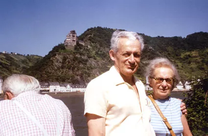 And another interesting thing: after they cleaned the train, it was an entirely different air in the train, and a child came, tossing ads on the seats. And the first thing I did was, of course, to look at the ads, and it was an ad for a boat trip on the Rhine. I told Gyuri and Andris I would love to participate. So it was all set. Gyuri didn't say a word, I said what I wanted to, and when we arrived to their apartment, he told me: 'Ani, I have a surprise for you,' and she showed me three tickets for the boat trip on the Rhine. This picture was taken on the boat. On the banks of the river there were castles all the way. These were all private castles, and if the flag wasn't up, it meant the owners weren't at home. This trip on the Rhine was quite an experience for us.