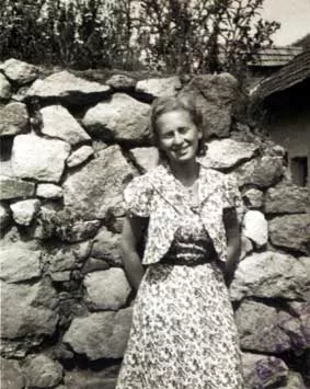 This is me at my father Hugo Schwartz's place. It was taken in Hungary, I was around thirteen-fourteen. I had beachwear on, with white and green pattern, with an open back, just like those you see these days. I had a little bolero for it to cover my back, because it was too conspicuous, of course. If you went to a lido, and before you put on the swimsuit, you could take off the bolero, but otherwise it wasn't fashionable to walk on the street with it. And I really loved this small dress. We had a sewing woman, Bozsi [Erzsebet], she made it for me, she was very skilled. The picture was taken by my brother with his own camera. I am especially fond of this picture. I have very nice memories from the time I spent at my father.