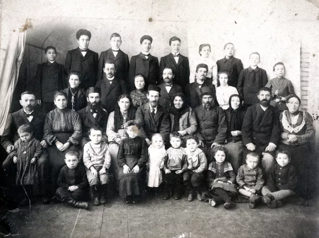 This is my mother's family in Priluki in 1905. My great-grandmother Rohlia Zbarskaya is in the second row. She is wearing a black shawl. My great-grandfather Isaak Zbarskiy is beside her. Their older son is on the right of my great grandmother. The first on the left in the second row from the top is my grandmother Hana Gandelsman, nee Zbarskaya, my grandfather Boruh Gandelsman is beside her. My mother Anna Gandelsman is the sixth on the right in the lower row, wearing a white dress. Her brother, who died in infancy is beside her and next to him is my mother's other brother Yasha Gandelsman. The oldest brother Moisey Gandelsman is the third on the left in the upper row. These are all I know.