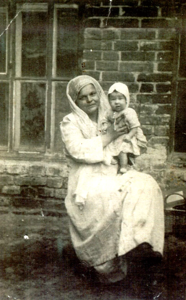 My nanny Anna Grigorenko is holding me. The yard near our house, Kharkov, summer 1918.