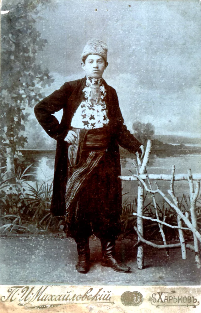 My brother Roman Gliena wearing a Ukrainian folk costume, playing a role in an amateur performance in a club. He is still an amateur actor. This photo was taken in Kharkov in 1927.