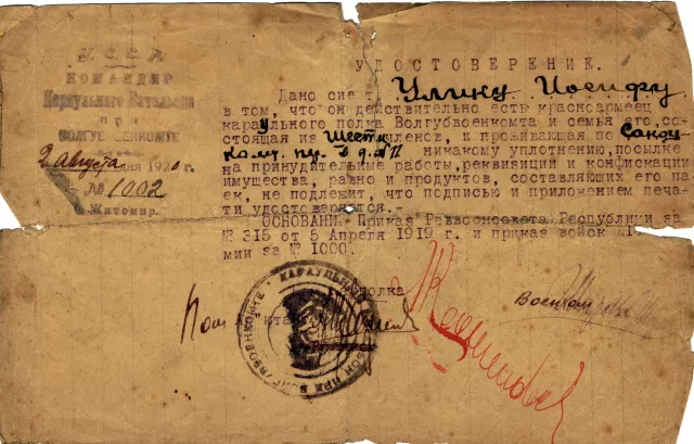 This certificate is given my father - Ulik Iosif, in that that it soldier of Red army and his family from six a person, does not subject the compaction and parcel on forced work, properties and product forfeitures, auditings.