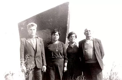 Standing by the common grave of Jews of Krasilov where my parents were shot and buried in Manivtsy village near Krasilov. From left to right: I, Arkadi Milgrom, my wife Lilia Yarkho, my sister Dora and her husband Yakov Goltsfarb. This photo was taken in the 1970s when we visited the grave of our dear ones, where there was a monument installed already. There were flowers by the monuments. It meant that there were still people in Krasilov who remembered those who perished during the WWII.