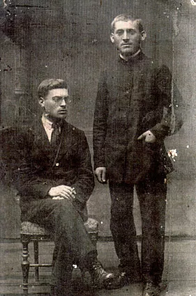 My father Itsyk is sitting and his brother Moishe Milgrom is standing. This photo was taken in the late 1910s in Lvov when my father was visiting there.