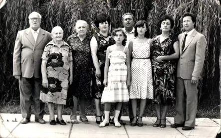 Our family was photographed during my wife Raisa's mother visiting us in Uzhorod. From left to right: my father Efim Yurkovetski, his second wife Zelda Yurkovetskaya, my wife Raisa's mother Anna Gitman, my wife Raisa Yurkovetskaya, my brother Igor's younger daughter Marina Yurkovetskaya, I, Arkadi Yurkovetski, my brother Igor's older daughter Svetlana Yurkovetskaya, my brother Igor's wife Rosa Yurkovetskaya (nee Babiak), my brother Igor. This photo was taken in Uzhorod in 1983.