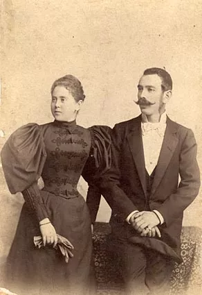 My grandparents are in this picture, Armin and Sarolta Mittelmann. I don't know the year this picture was taken, but they look very young. The picture was taken in Marosvasarhely in the photo studio of Geza Csonka on Kossuth Street. The studio was founded in 1904.