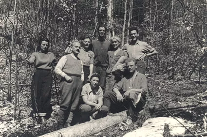 This photo is from the Turiec region, near the village of Motycky, where we were in hiding. It was taken in March 1945, shortly before we returned home. I, Heda Ambrova, at that time Hechtova, am sitting on the ground along with Dominik Ruzicka. Standing behind us, from left: Our connection, a German woman named Mitzi, my father Arpad Erdelyi, I don’t know the next person, Vojtech Kürti, I don’t know the next person, and Karol Kürti.