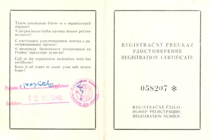 After surviving the war and returning to my home town, we began a new life. This document was issued to my father, Arpad Erdelyi, by the Czechoslovak Repatriation Office on 25 June 1945.