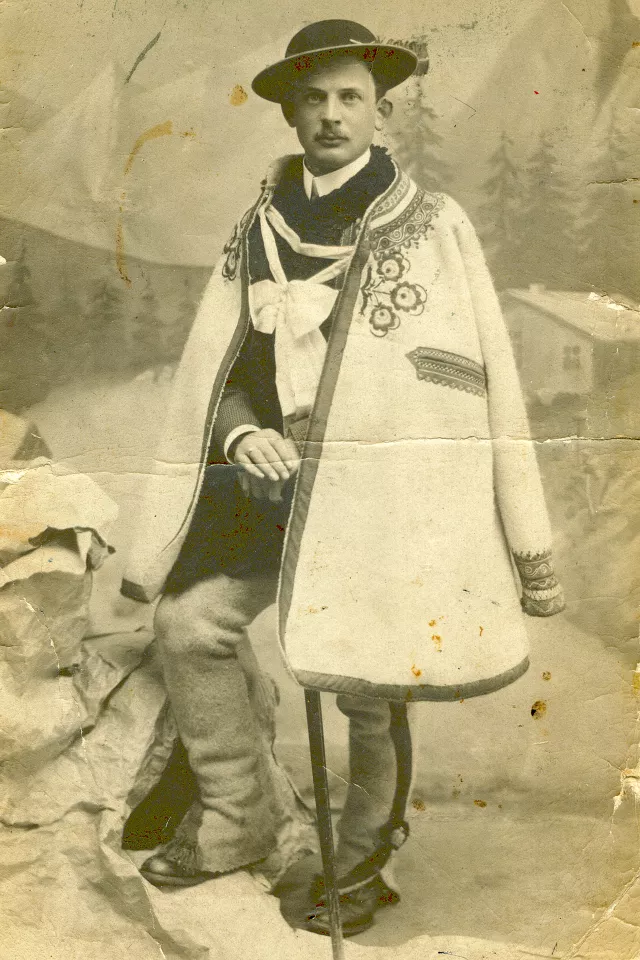This is a photo of my partner Renata Zisman's father Artur Springut, taken in the 1910s. It was probably taken in one of the tourist places in Polish mountains like Poronin, Zakopane or Nowy Targ, but it could also have been taken in Zywiec. On the photo he is wearing traditional mountainer's clothes.