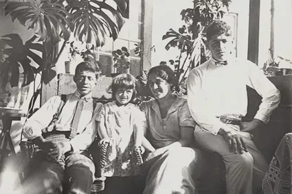 This photograph was taken in the 1920s in the atrium of the Kürti family home in Ruzomberok. From left to right it shows: Alexander Kürti, Magda Erdelyiova, Malvin Kürti and Vojtech Kürti.