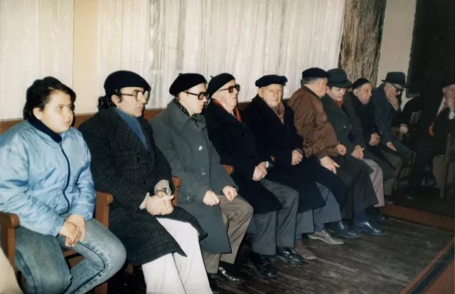 This is a photo of the men most frequently visiting the [Great] synagogue - the third one to the left is Leon Burla, who can blow the shofar. Next to him is his father Vitali Burla, who was a member of the [Israeli] Spiritual Council. Vitali is a very clever man, a mathematician. He used to be a lecturer for many years, but unfortunately he got ill. The sixth from left is my brother Isak Levi, the seventh is called Razon, and currently he lives in the Home for elderly people [supported by the Jewish community]. The second from left is Kiril Ivanov - he had a Bulgarian name, yet he has officially taken a Jewish name - Itzhak Benavram (as his mother is Jewish). The picture was taken at the synagogue on a Saturday morning in the 1980s.