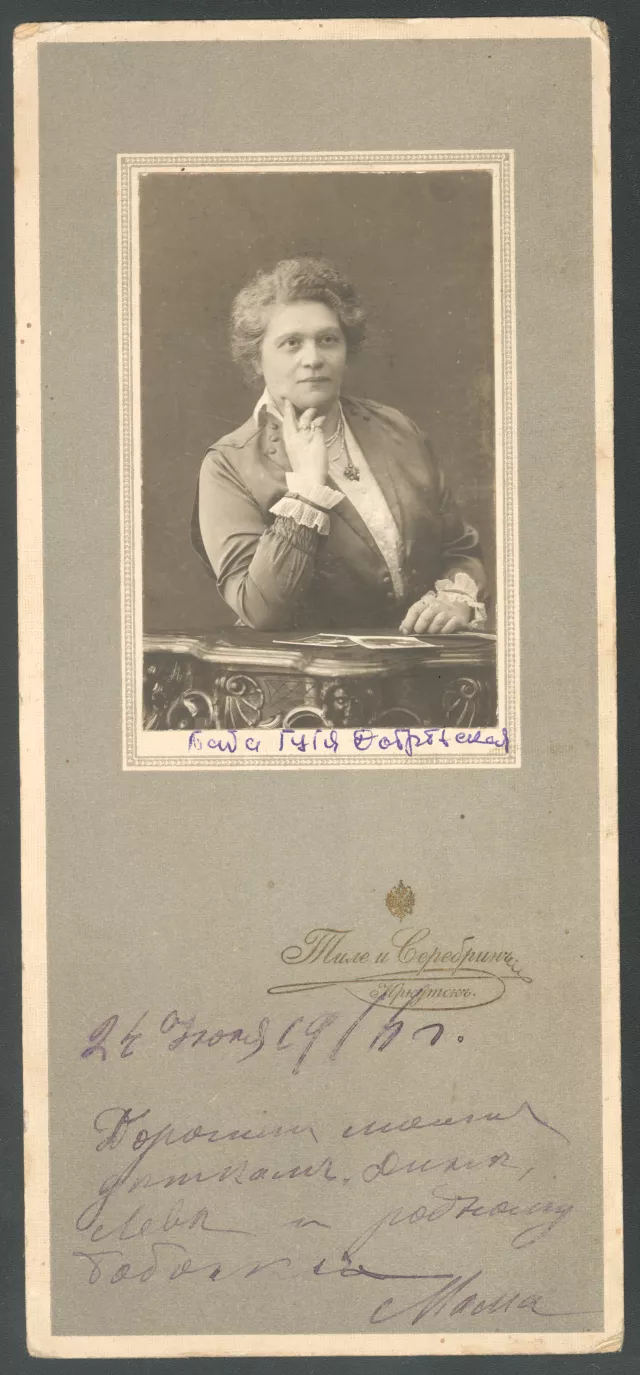 This is my great-grandmother on my father's side, Augusta Borisovna Dombrovskaya. The photo was taken in Moscow in 1915. The inscription reads: ‘To dear Dina, Lyova and beloved Bobochka.’ Dina was Augusta's daughter, my grandmother Dinora Dombrovskaya, Lyova is her son-in-law Leib Borisovich Zilber, my grandfather, and Bobochka is my father, Boris Leibovich Zilber.