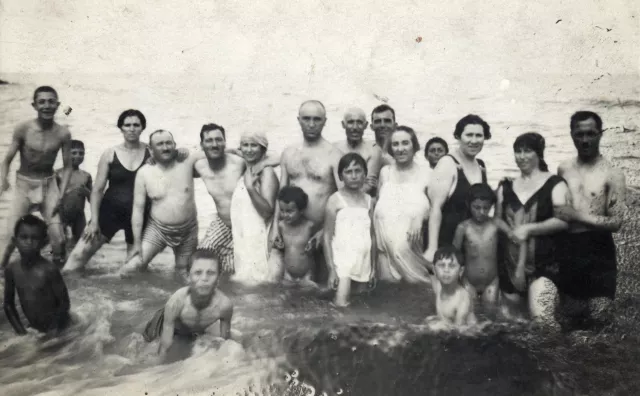 The fifth and sixth from left to right are my father Avram Avram Kalaora and my mother Donna Avram Kalaora. I am the most tanned child on the photo. I am ten years old here. I do not know the names of the others. I only know that this is the first and the last time my parents went to the seaside. Those were very poor times.