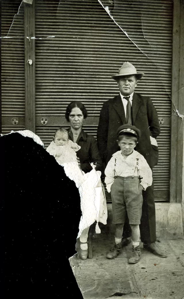 This is my family in 1929, taken in front of a shop in the center of Sofia. My father, Avram Mordohai Konorti, and my mother, Regina, were 29. My brother, Mordohai Avram, was 6, and I was still a baby. When I was a child, most Jews were merchants. Of course, they practiced other professions, too. My father, for example, was a carter; there were craftsmen, too. Jewish people belonged mostly to the middle class, but there were very rich people, too - factory owners, tradesmen with big shops.
