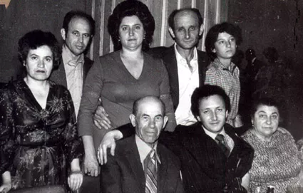 This is a family photograph of my mother's brother Avrum Alterman. Sitting from left to right: Avrum, his son-in-law, his wife Basya. Standing from left to right are the Avrums daughters: Charna, Molka and Tsilya, and their husbands. The picture was taken in Kishinev in the 1970s.