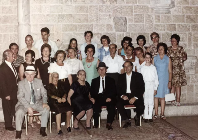 This is the bar mitzvah of Reni (to my regret I cannot remember his full name), the son of my elder brother Sinto Kohen (first from left standing in the second row). On the photo he is standing dressed in white. The others are my parents Iafa Beniamin Kohen, and Beniamin Shemtov Kohen, sitting in center, third and fourth from left to right, and other relatives, whom I cannot recognize. The photo was taken in 1972 in Tel Aviv.