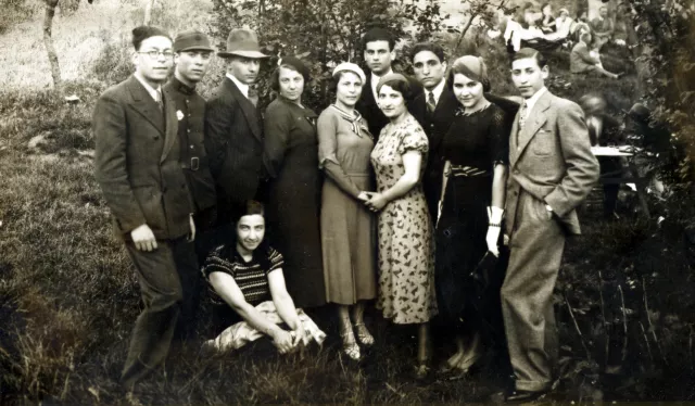 This is a photo taken in 1933. At that time, the residential areas ended in Sisli. There was nothing after Sisli. No Mecidiyekoy, like today. It was all empty lands and fields. There used to be garden called Barbaouka. This was a fruit garden. This photo was taken in May. We went there with various friends. I don’t remember the names of all of them. The first from left to right is Albert Par, I don’t remember the second, the third is Izak Rofe and his siter is beside him; the sixth is Moiz Atiyas and the girl kneeling in front is his sister, and then there’s me at the right. I don’t remember the others. That day was probably a weekend or holiday and we went there for some fresh spring air. We sat at the garden, had lunch there and that’s it really.