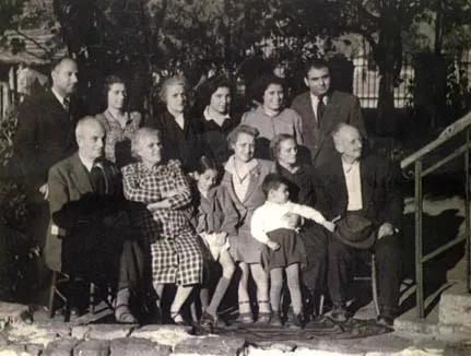 In the first row, sitting from left to right are: my father, Yuda Samuil Behar, next to him is my mother Liza, next to her is my father’s granddaughter, my brother Samuil’s daughter. Her name is Lily. Next to her is my father’s sister Ester. Next to her is Bouka Behar, the wife of my uncle Nisim, my father’s brother. She is holding Gabriel Nisim Behar, Nisim’s grandson. She is next to uncle Nisim.