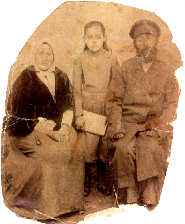 These are my husband's grandmother and grandfather. The girl in the photo is my husband's mother Hana. This photo was taken during Chanukkah in Yedintsy [today Moldova] in 1900s, where my husband’s family was originally from. I don’t know anything more about the photo.