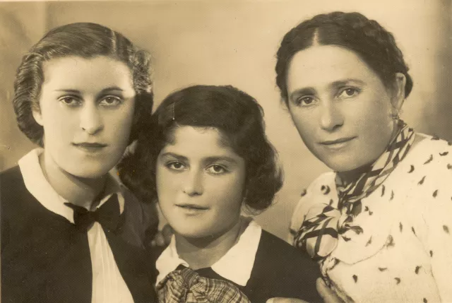 To the left is my cousin Beile Ronder, daughter of father's brother Yudel. Next to her is her friend from Lithuania with her daughter, who was born in Palestine. I do not remember their names. The picture was made in Kedainiai in 1938, when they came from Palestine.