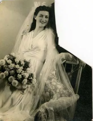 In this photo we can see my cousin Beki in her wedding dress. The interesting thing about this photo is that the groom has been cut off from the picture. My cousin Beki’s first marriage was to a man she met in Israel and she sent her grandmother her wedding picture. This was a very traditional behavior. Unfortunately this man she married had some sexual problems and my cousin divorced him. Beki’s maternal grandmother, my paternal grandmother, Rasel Baruh cut off the groom from the picture as soon as she got the news of her granddaughter’s divorce.