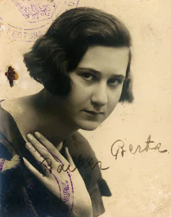 I think this is my first passport photo. After my father my name was Bacher, that’s why it is written Bacher Berta on it. This must have been taken in Marosvasarhely. There wasn’t any photographer in Toplica. They didn’t take photos in Toplica. I made my hair wavy here. One can see that I had a thick hair, but it was even, so we made it wavy. I know that all the photographers asked me to show my hand somehow, as I had such beautiful hands. I had very nice hands, and they were slim, long! One can see it. The photographer already knew me, and always asked me to put it here, put it there, so that my hand showed.