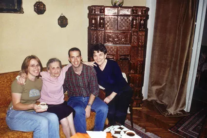 This is in Marosvasarhely, in one of my rooms. The boy is the grandson of my second husband’s cousin, Sara Spiccer, called by the family Piri, they are man and wife [with the girl]. The first from right is Ilka [the person who takes care of Bella Steinmetz]. The photo was taken about 4-5 years ago. They came to greet me.