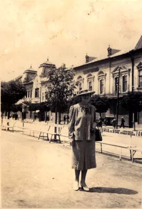 This was taken in Marosvasarhely. This was a wonderful, mustard-yellow dress, with smooth dots, sized like peas. Well, if you passed your hand over, you could feel it, so it wasn’t completely smooth. A costume: a simple dress and an short open jacket over it. They still make clothes like this. I bought the hat here. I didn’t wear such hats while I was girl, only when I was a married woman. I suppose I was 25-26 here. This is a large straw hat with all kinds of flowers on it. I ordered it from the milliner, there were ribbons, and one put single-colored ribbons, the other something else..., mine had flowers. The straw hat was fashionable at that time. And winter hats were made of different materials than the summer ones. It was interesting that we started to wear spring hats at the end or at the beginning of April. At the end of April one could see spring hats. Caps were put aside at the end of February. So it was still cold, but women wore straw hats, and let’s say a warm coat. This was the fashion those times.