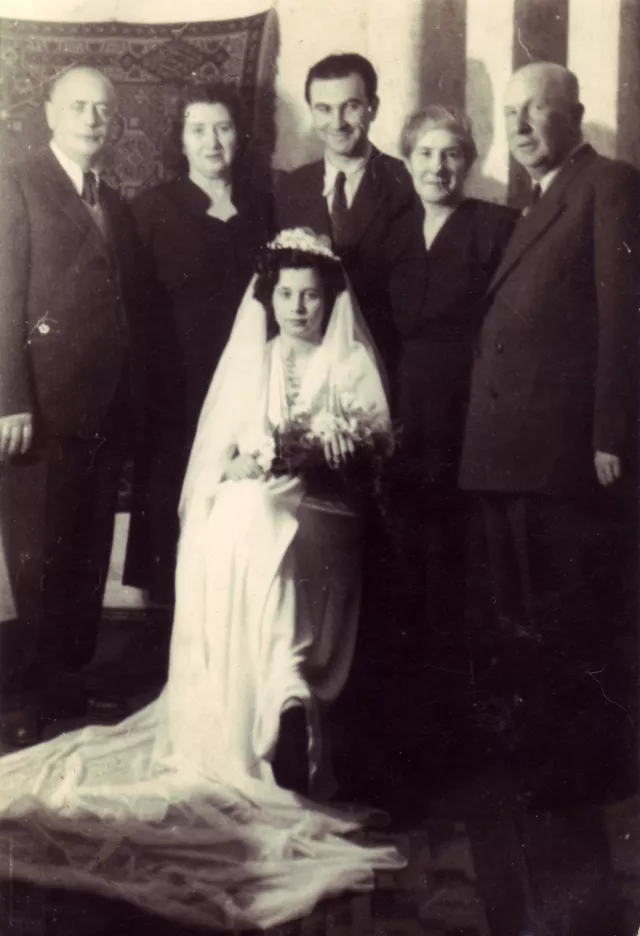 In this photograph, the second from the right is Clara Rintler, uncle Avram Klein's eldest daughter. The one next to her, on the right, is her husband, and the groom on the left is their son, Beno Rintler. The ones on the left, next to the groom, are probably the parents of the bride. Beno Rintler and his wife lived in Botosani as well, but I no longer remember what they did for a living. I believe they were employed, but where - I forget. The photograph might have been taken in the 1950's.