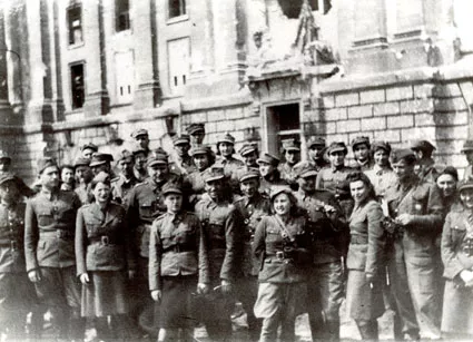 This photo was taken in Berlin in May 1945. It is the First Polish Army. The picture must have been taken by an army photographer. The commander of this division, Col. Swietlik, is second from the left. His wife is next to him and her sister is fourth from the left. I am third from the right, without a cap. The officer on my right joined this division from Anders’ Army.