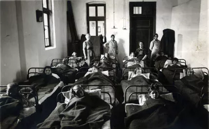 Here I am at the Catholic nursery school. I am in the second row, the second one from left to right. Usually two of us would sleep in one bed but this time, because of the photo, they let each one of us lie in a separate bed. The year was 1941. The second teacher from right to left, whose name I can’t remember, warned my parents to take me from there and never take me there again, that we weren’t treated well there. There is neither a stamp of a photo studio, nor any other inscription on the back of the photo.