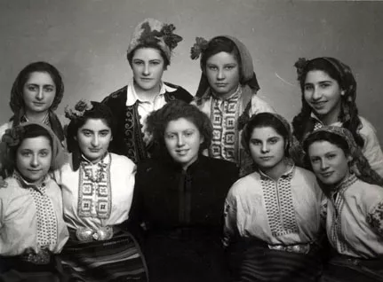 The photo was taken during my second year at ORT. There was an amateur dance group at the time. The teacher, whose name I can’t remember, is in the middle. She was half-Jew. I am in the first row, the first on the left. Behind the teacher is Vera who has a kerchief on her head – she is Bulgarian, a friend of mine. There were some Bulgarians studying at ORT as well.