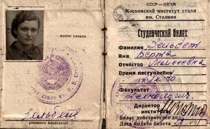 This is my student's card, issued to Berta Zelbert, the student of Technological Department of Moscow Steel and Alloys Institute named after Stalin. I entered the institute on the 1st of September 1940.