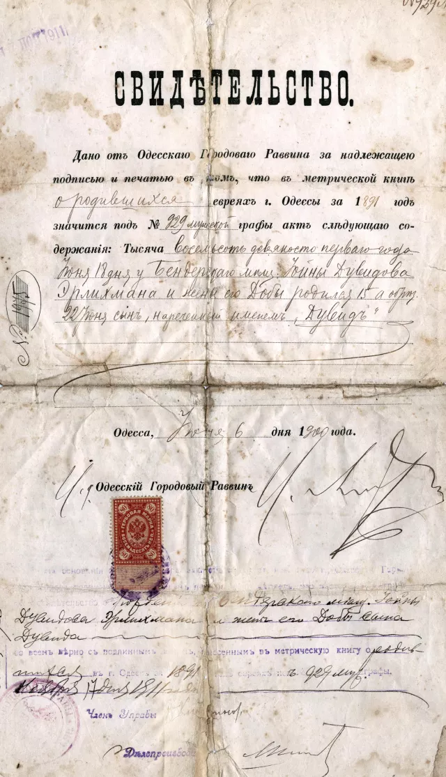 This is an excerpt from my father David Erlihman's birth roster certified by the rabbi of Odessa town. This excerpt was made in Odessa in 1900.